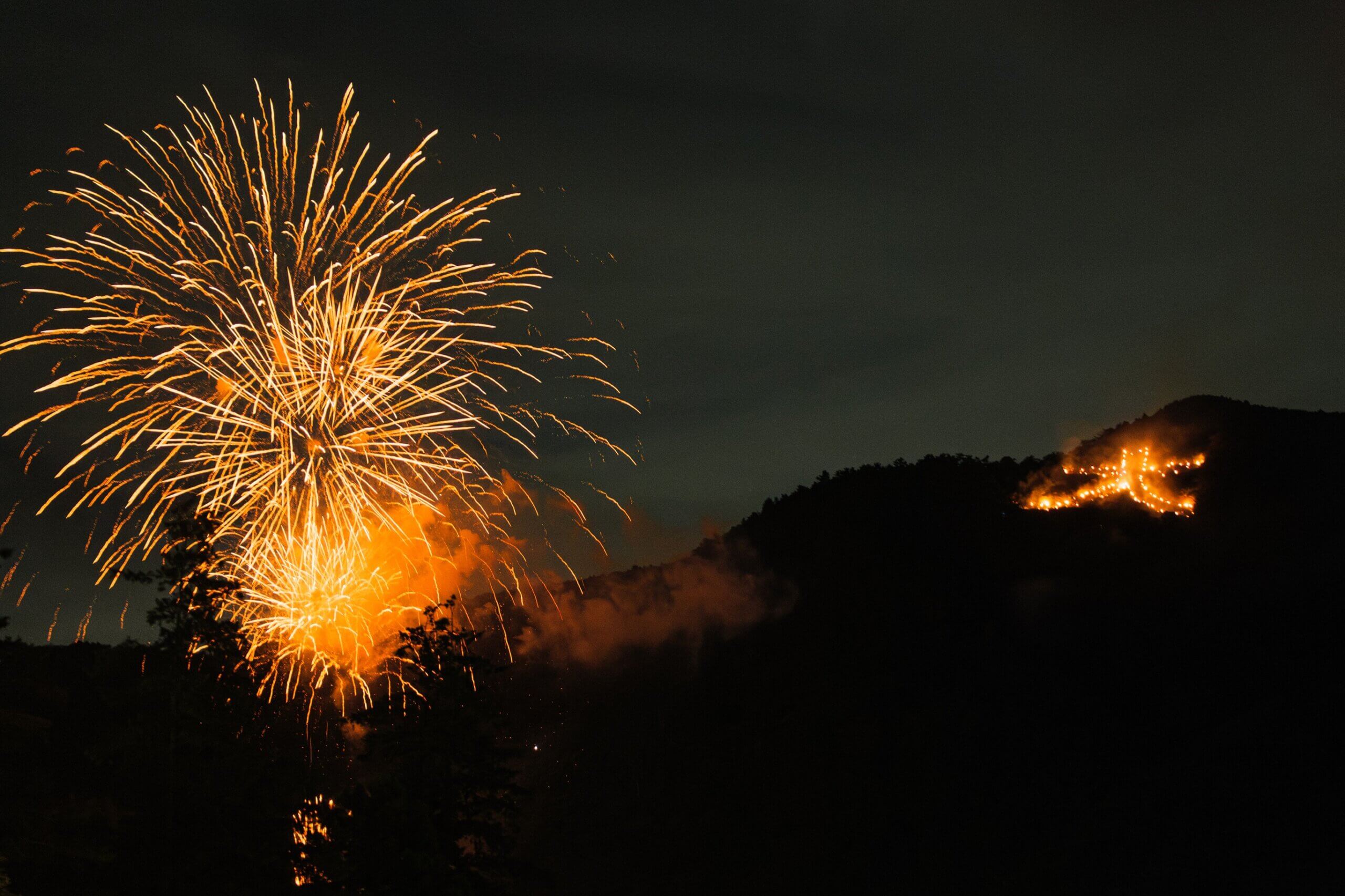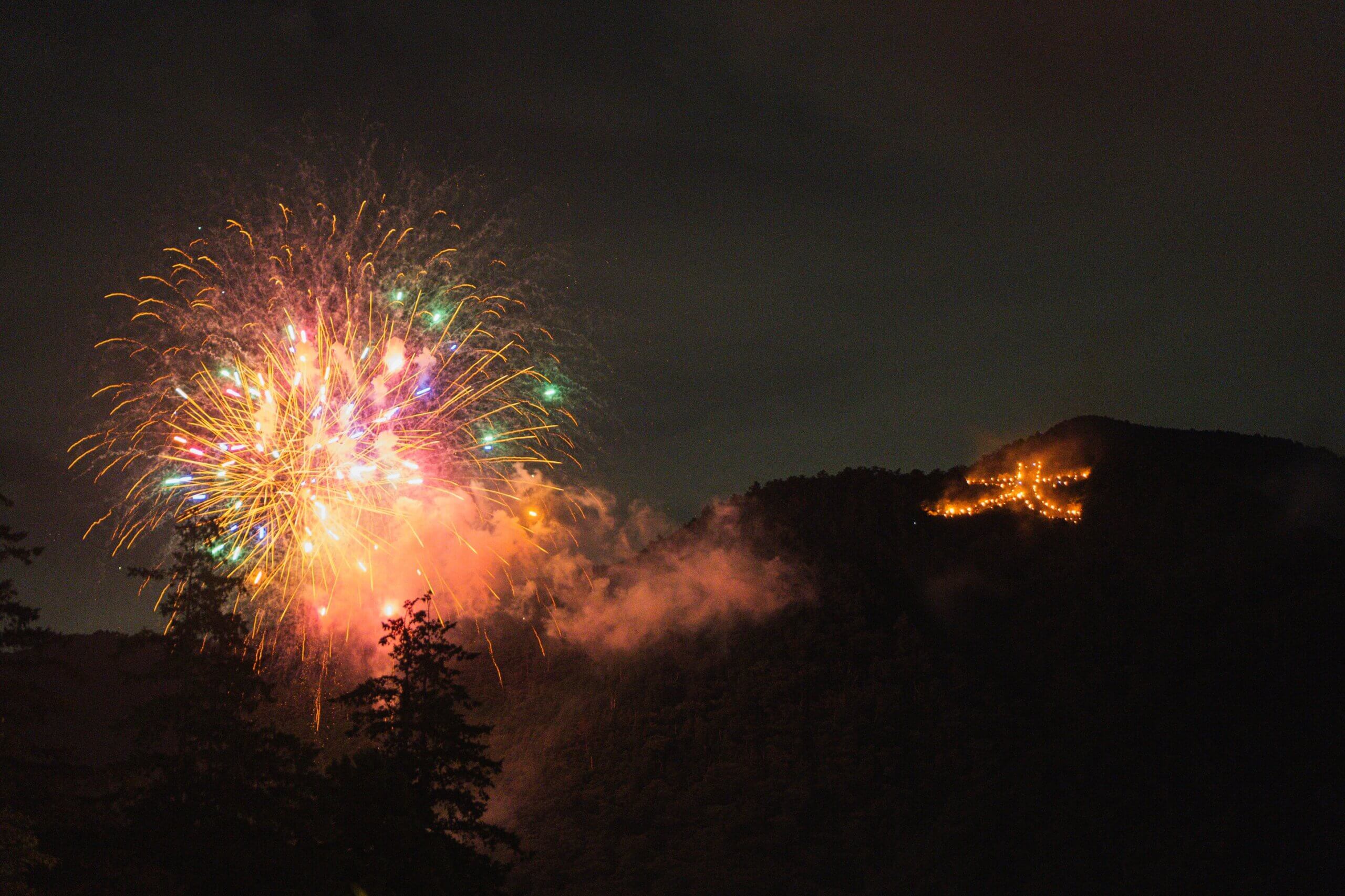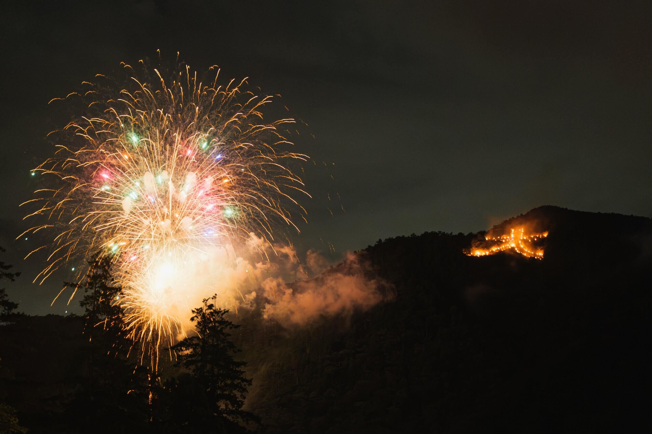 箱根・強羅 佳ら久の目の前にある明星ヶ岳に大きく描かれた「大」の文字に火が灯され夜空に浮かびあがり、打ち上げ花火や仕掛け花火のナイヤガラとともにご覧いただけます。