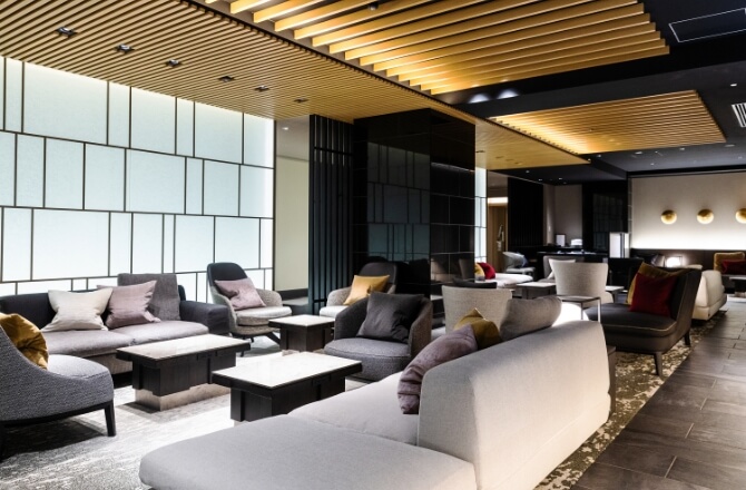 おのおのの用途に沿って集えるよう、ラウンジの家具の形状やファブリックはあえてランダムに。ゆったりと深く座ることができる読書席や隠れ家的雰囲気のラグジュアリーな席、一体感のあるファミリー席など、多種多様な席からいちばん心地よいスペースを見つけてください。やわらかく照らす光壁も、居心地のよさを引き立てます。