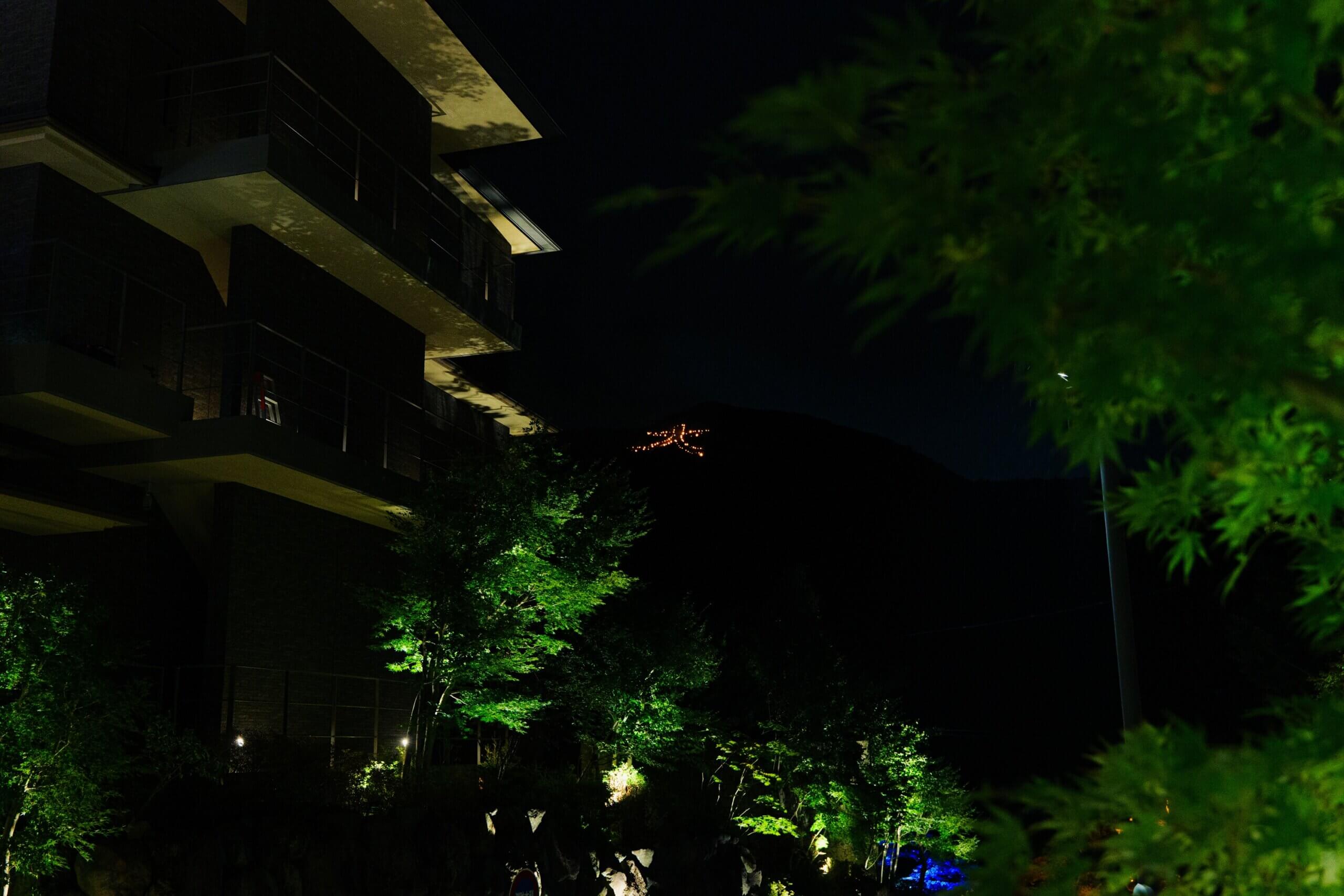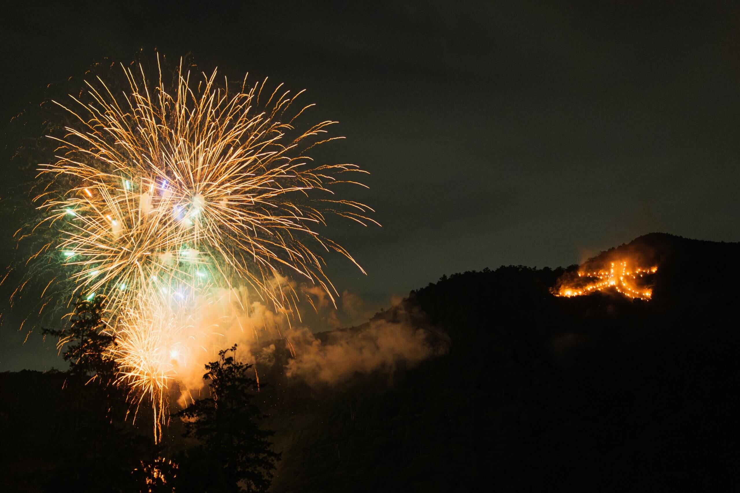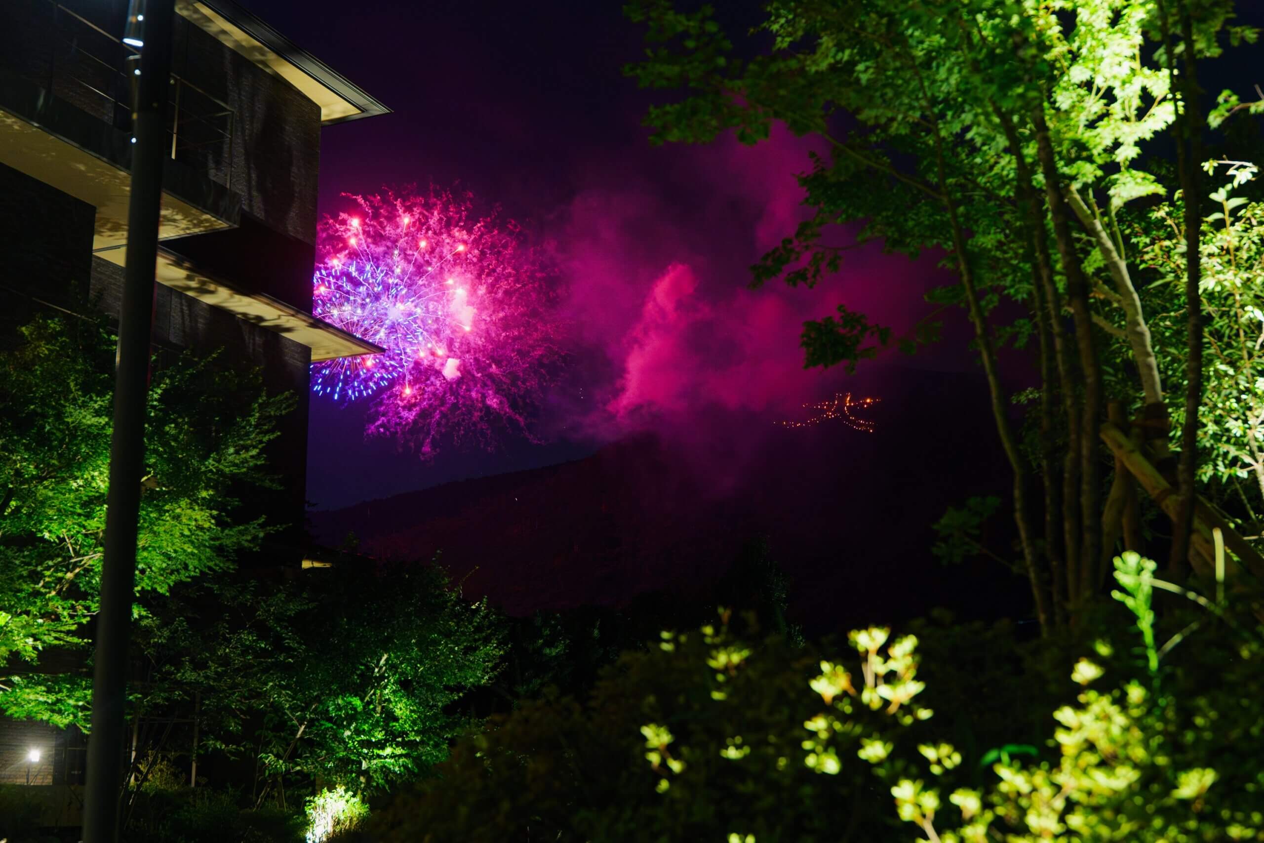 箱根・強羅 佳ら久の目の前にある明星ヶ岳に大きく描かれた「大」の文字に火が灯され夜空に浮かびあがり、打ち上げ花火や仕掛け花火のナイヤガラとともにご覧いただけます。